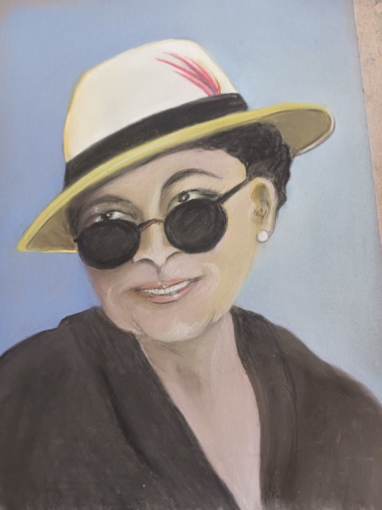 Dot used soft pastels on Clairefontaine Pastelmat paper for her portrait of Yoko Ono. Lovely use of soft pastels, Dot. Well done as we can see straight away who the portrait is of!