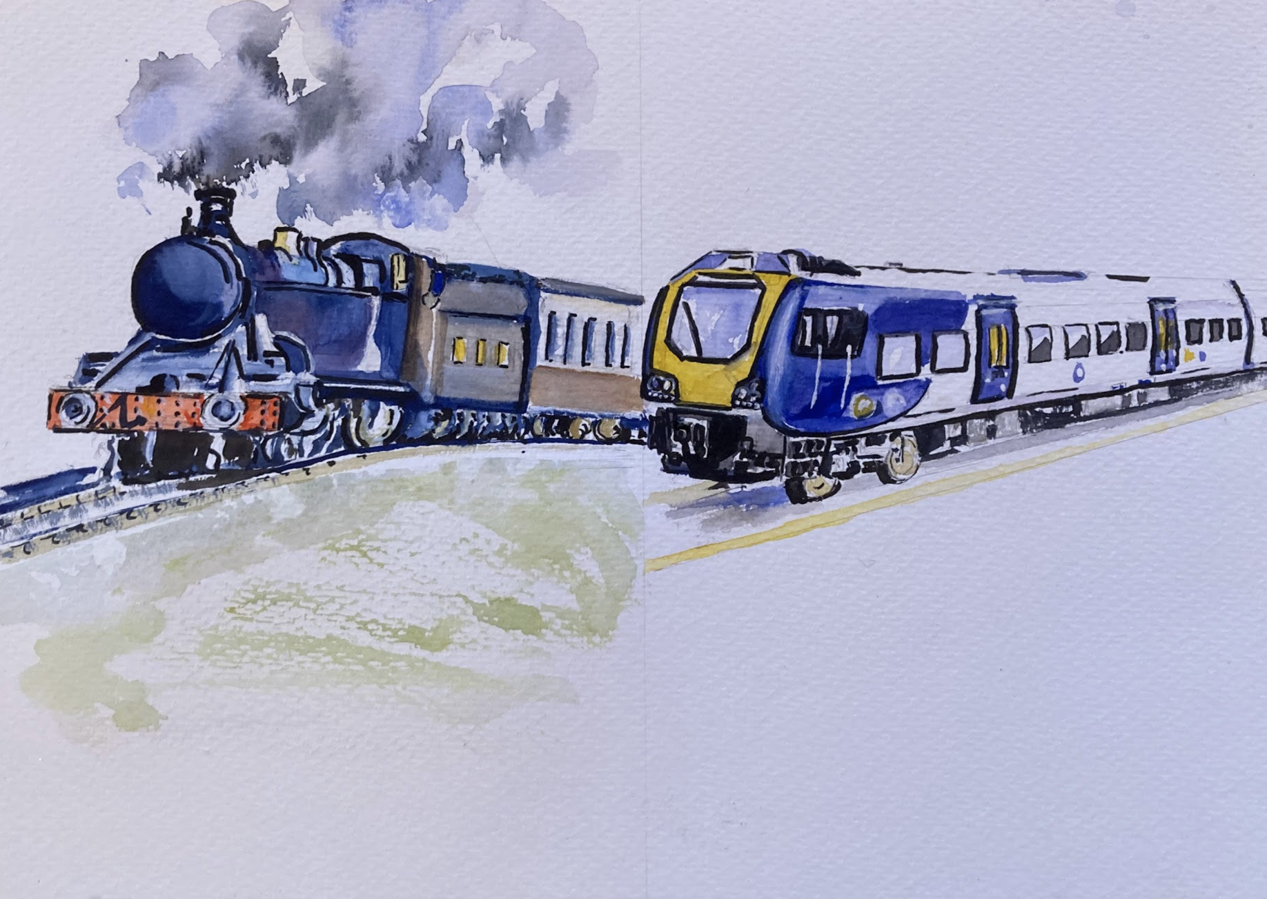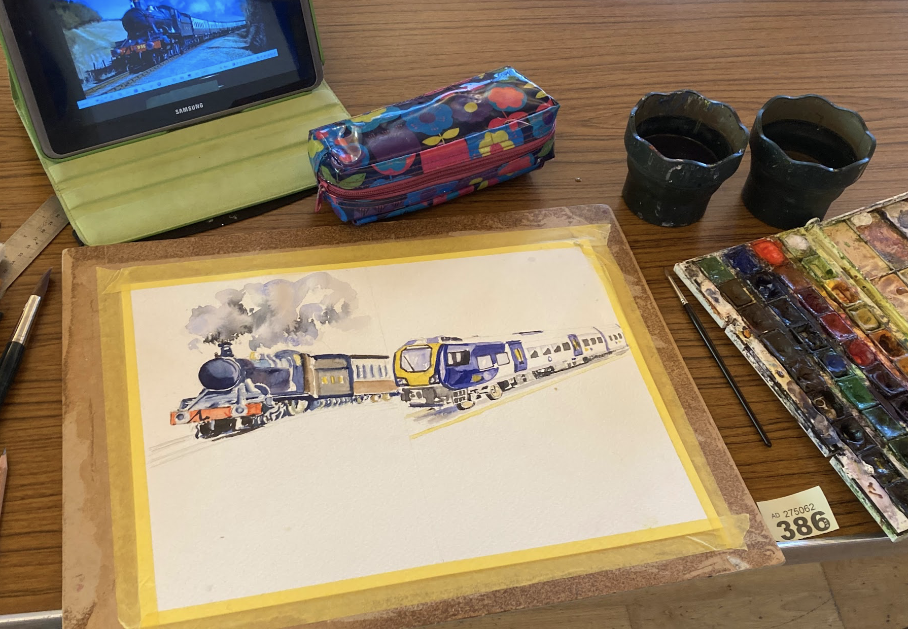 Steve finished his watercolour painting of train with a cowcatcher fitted to the front