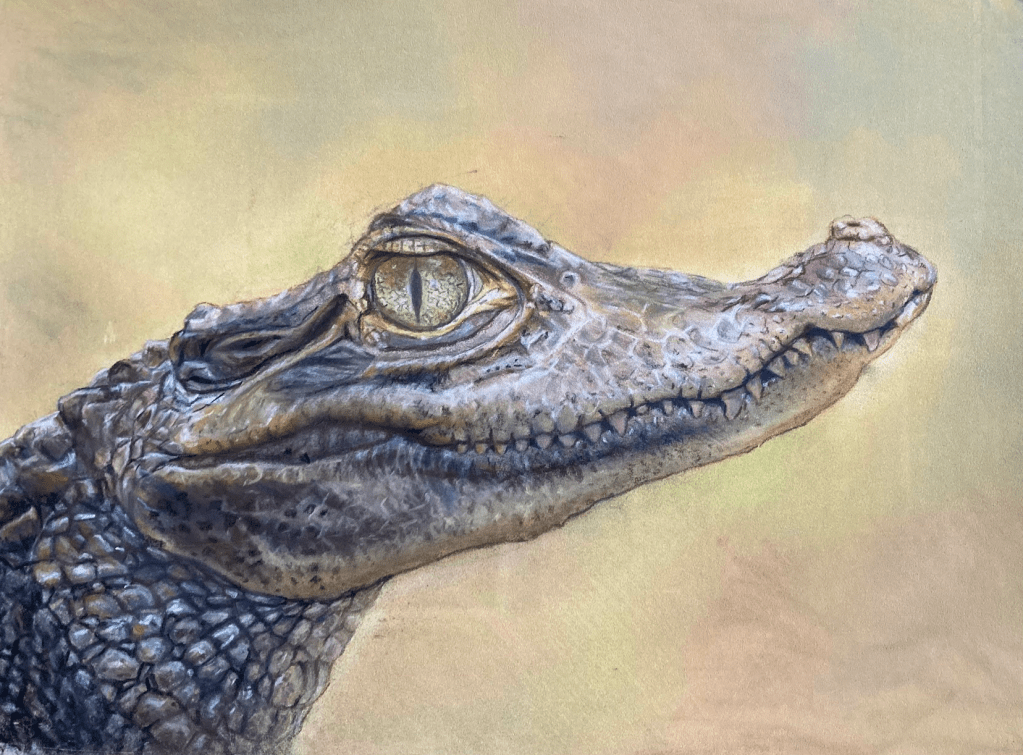 Steve completed his soft pastel picture of a Crocodile. He used mainly pastel pencils for the detail and soft pastels for the background and of course the colours were blended with pieces of grey pipe lagging.