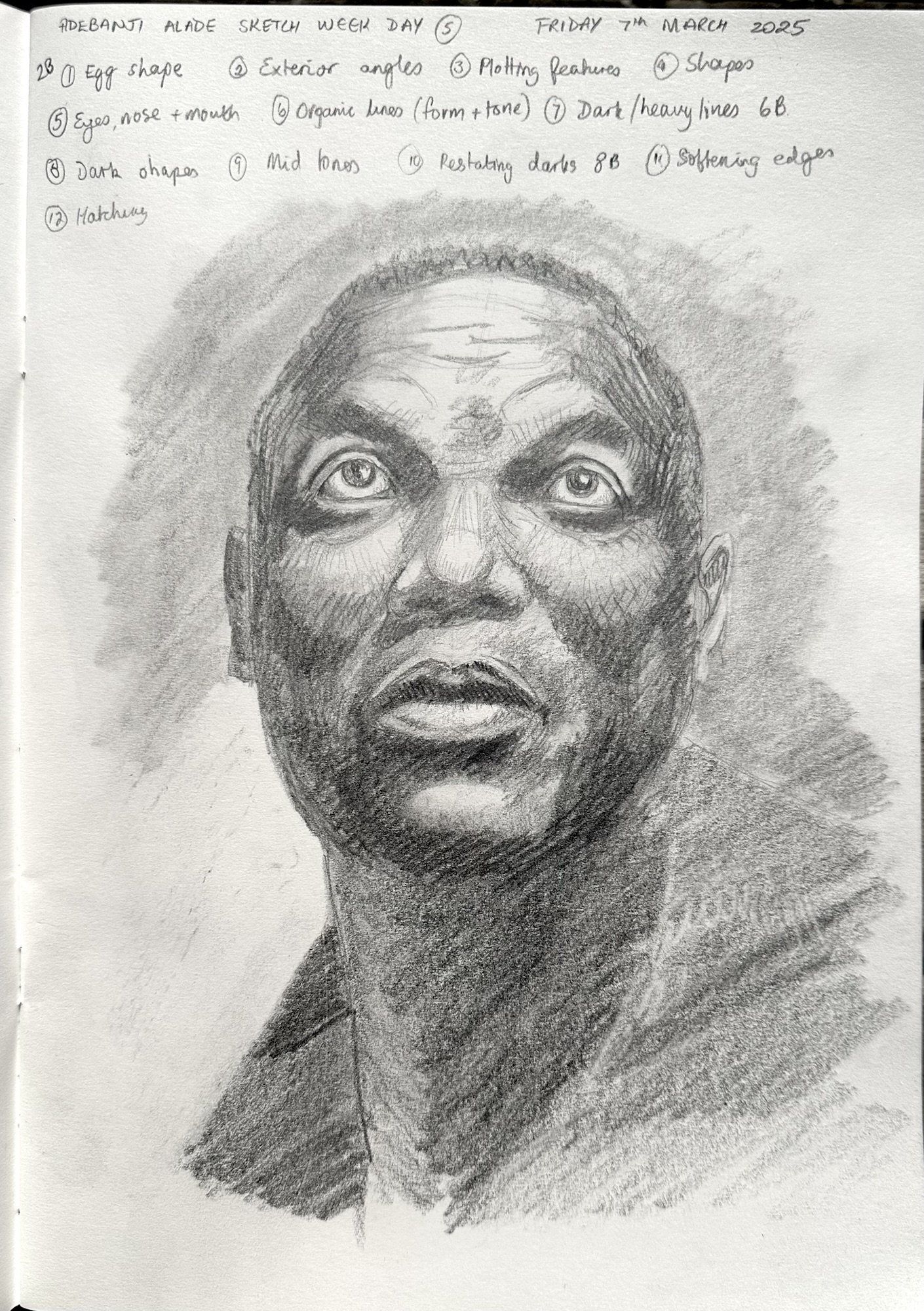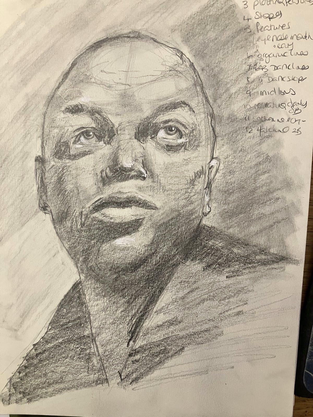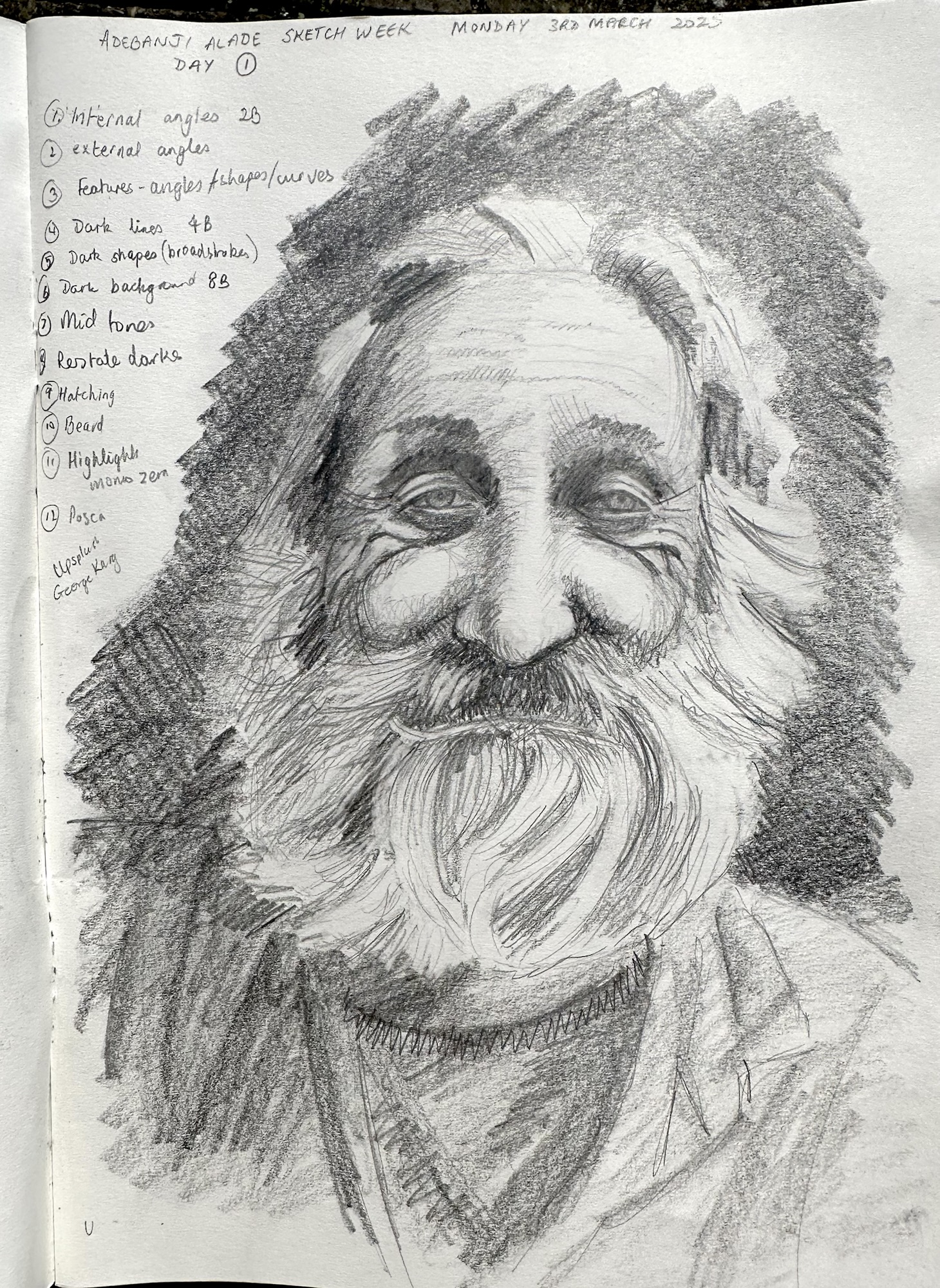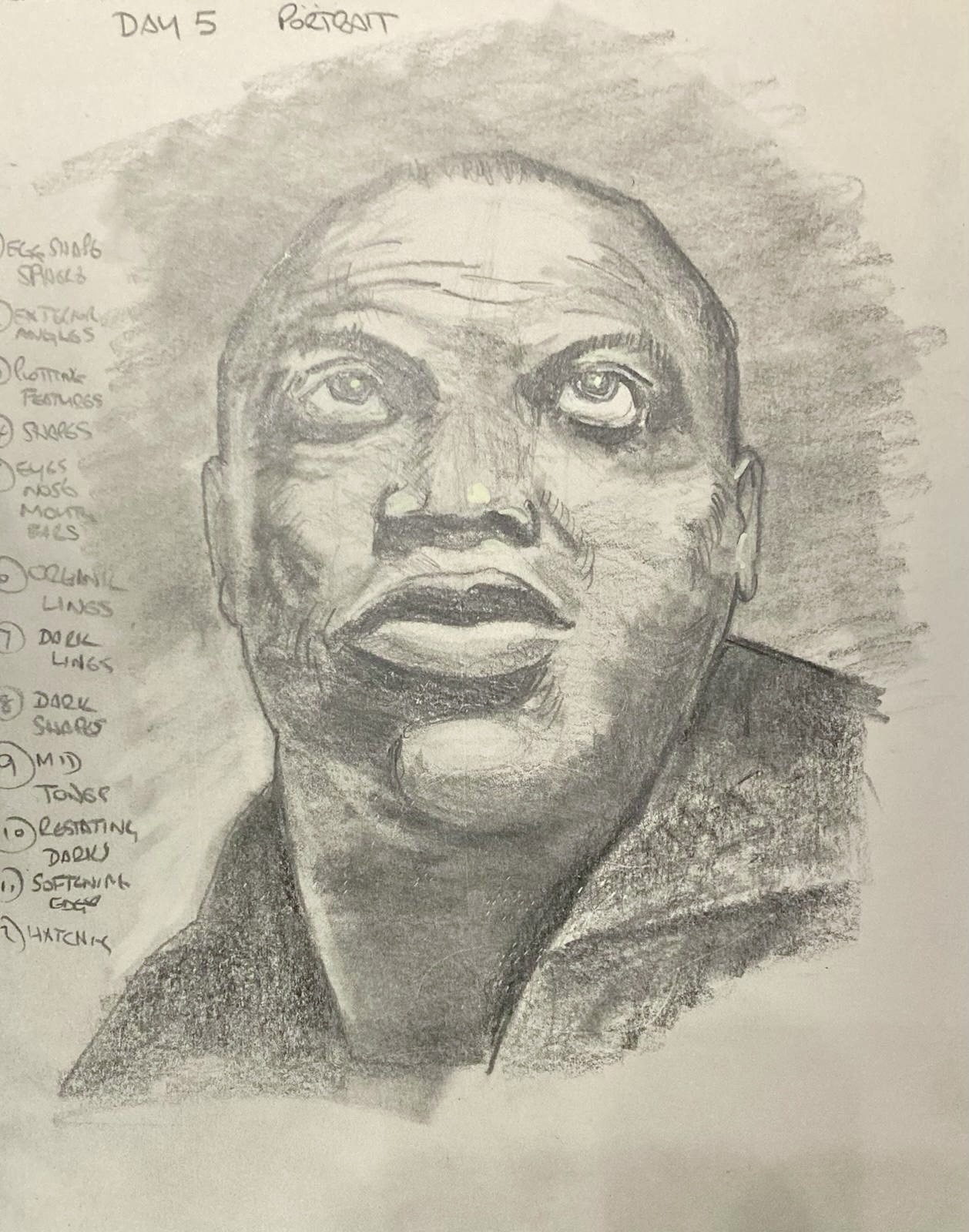 We all enjoyed the evenings sketching live or catching up and thought it was fantastic value at only a tenner learning from such an experienced tutor. Adebanji’s enthusiasm is infectious and you really want to do your best. It felt exhausting sketching and learning at the same time but you could pause the live programme then play it again. We all liked learning how to sketch like this and using blending stumps and hatching and will use everything we learned in our own sketches in the future. Follow Adebanji’s advice and don’t sketch for more than one hour, stop after 60 minutes and they will forever be a sketch and not a perfect drawing.