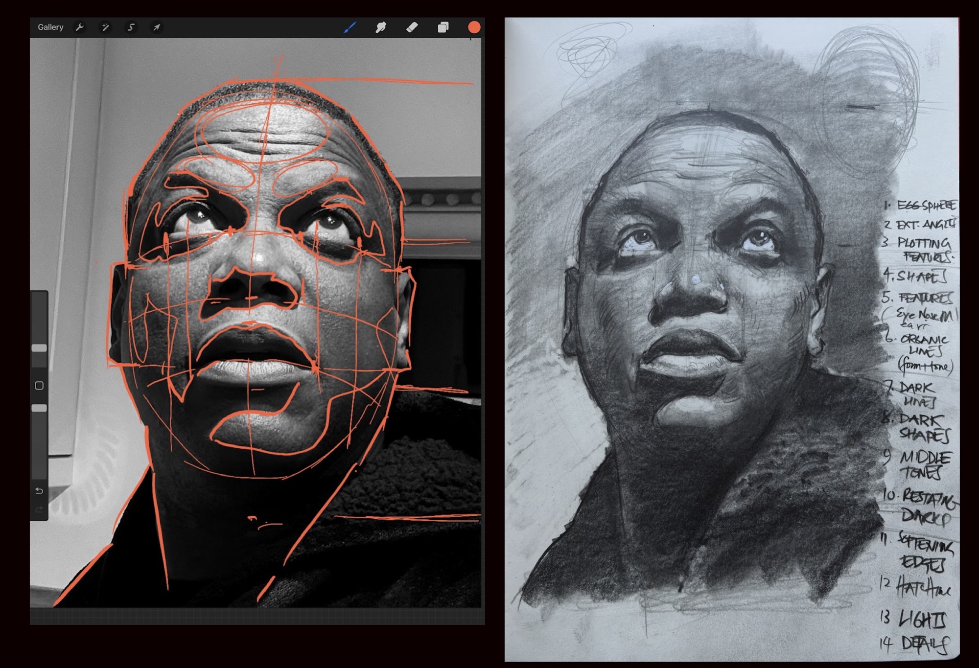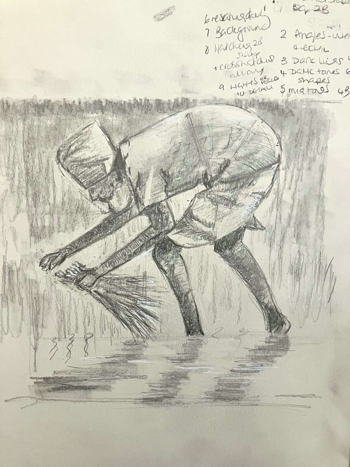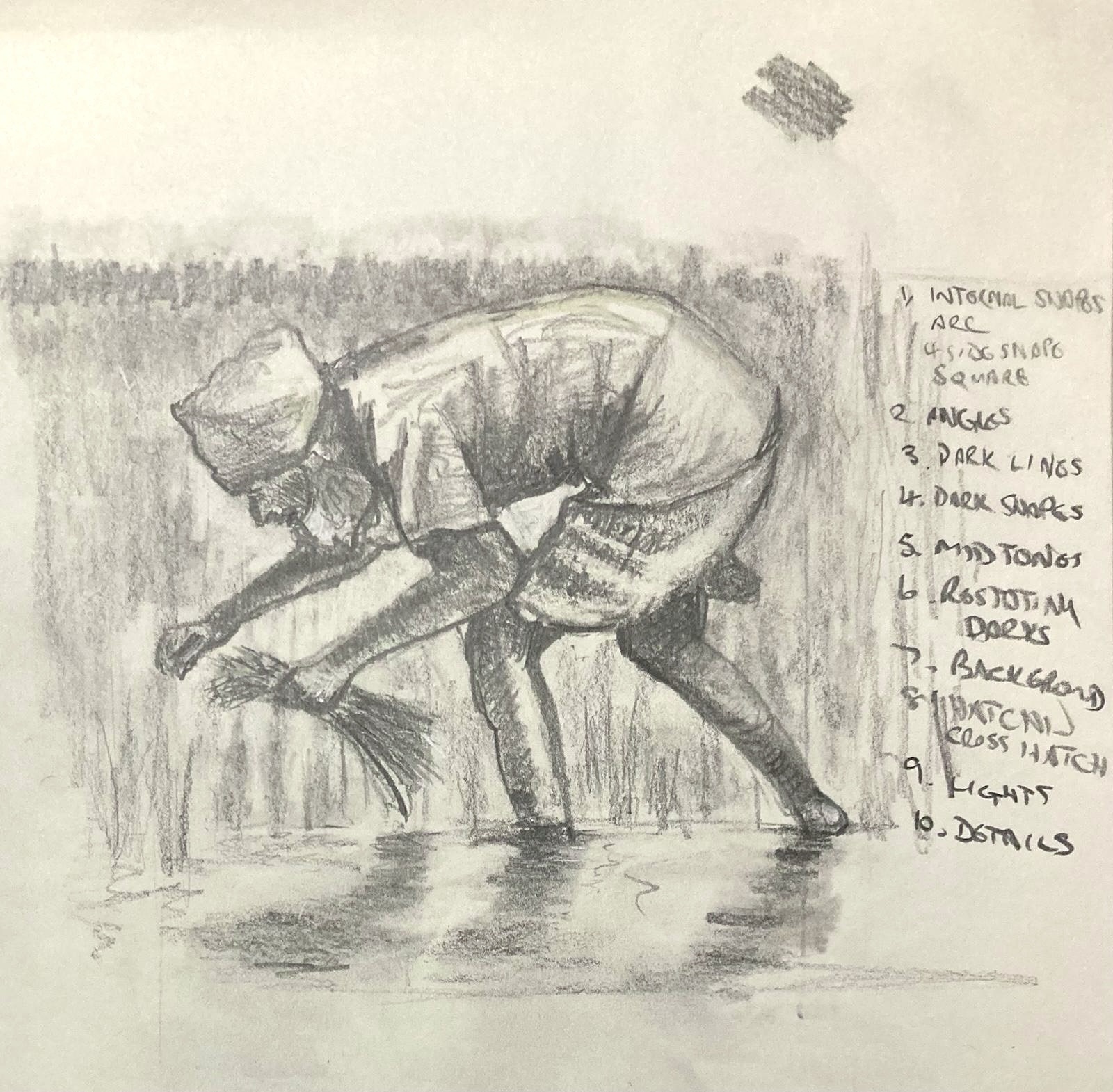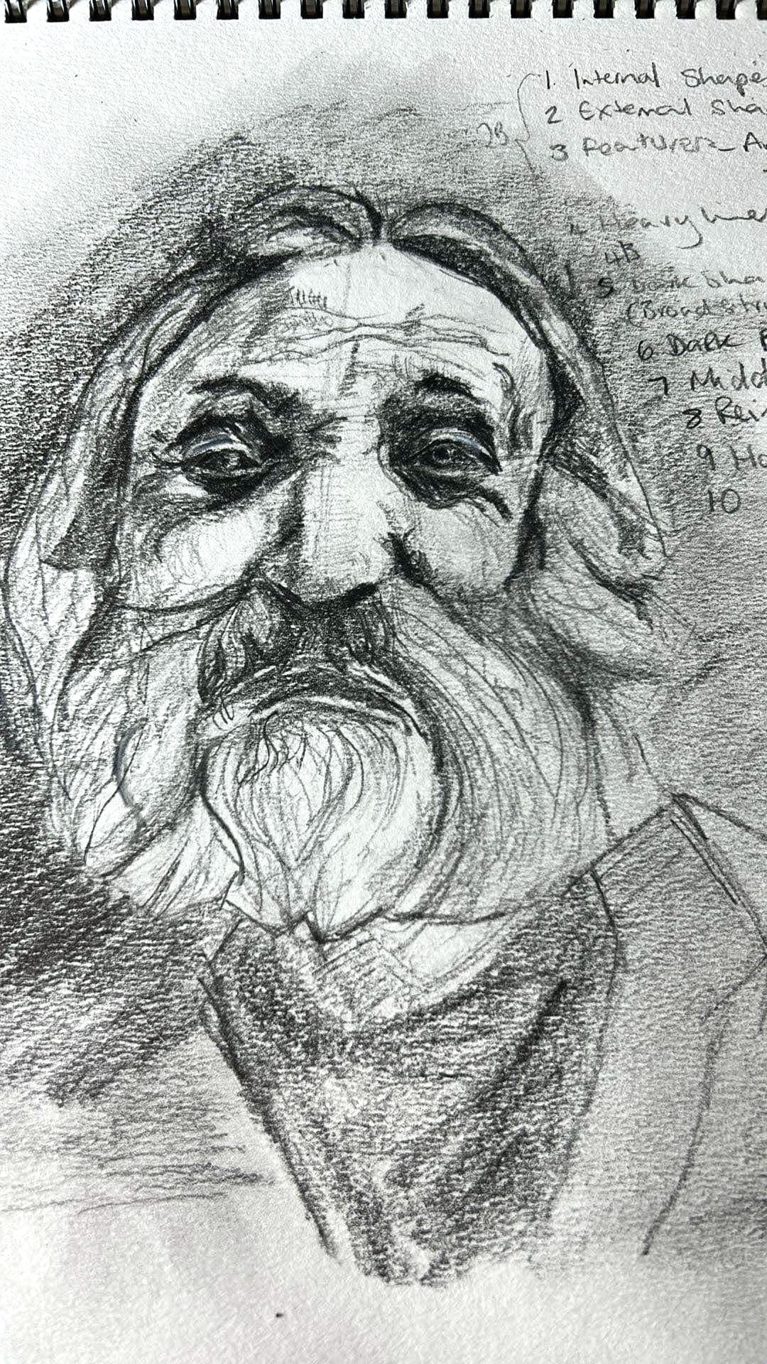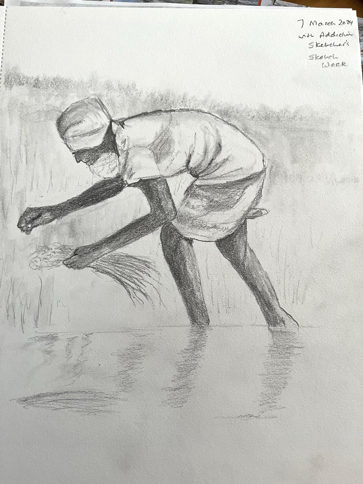 We all enjoyed the evenings sketching live or catching up and thought it was fantastic value at only a tenner learning from such an experienced tutor. Adebanji’s enthusiasm is infectious and you really want to do your best. It felt exhausting sketching and learning at the same time but you could pause the live programme then play it again. We all liked learning how to sketch like this and using blending stumps and hatching and will use everything we learned in our own sketches in the future. Follow Adebanji’s advice and don’t sketch for more than one hour, stop after 60 minutes and they will forever be a sketch and not a perfect drawing.