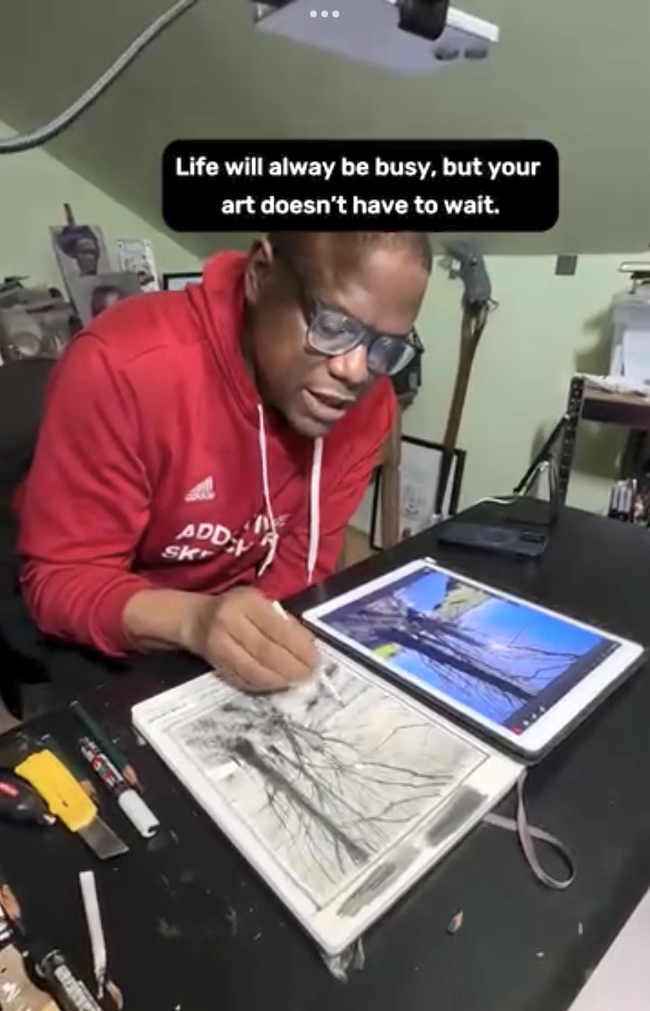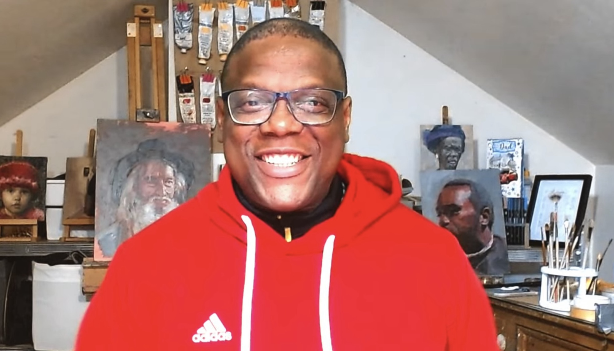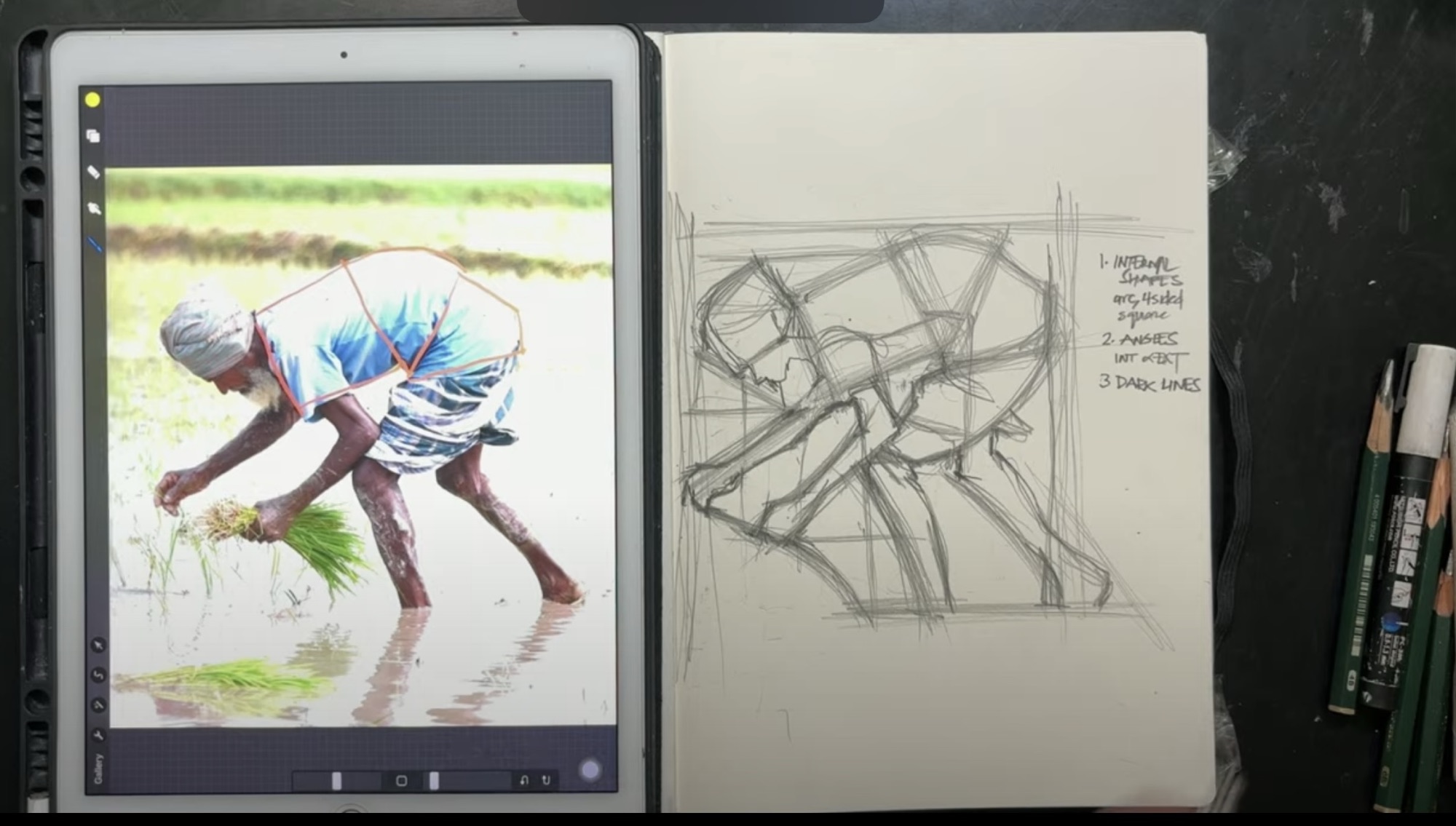 Adebanji showed how to grid the reference picture and then reduce the photo to external and internal angles, internal shapes, light lines, dark lines, light tones, middle tones, dark tones, erasing areas then reinstating darks. Whilst the sketches start loose the image suddenly appears and in an hour you are done. You’re encouraged not to fiddle with the sketch but to leave it as it is otherwise you try have a perfect sketch, but they not meant to be perfect. After sketching he encourages questions online from the public and spends another 30 minutes to an hour answering them.