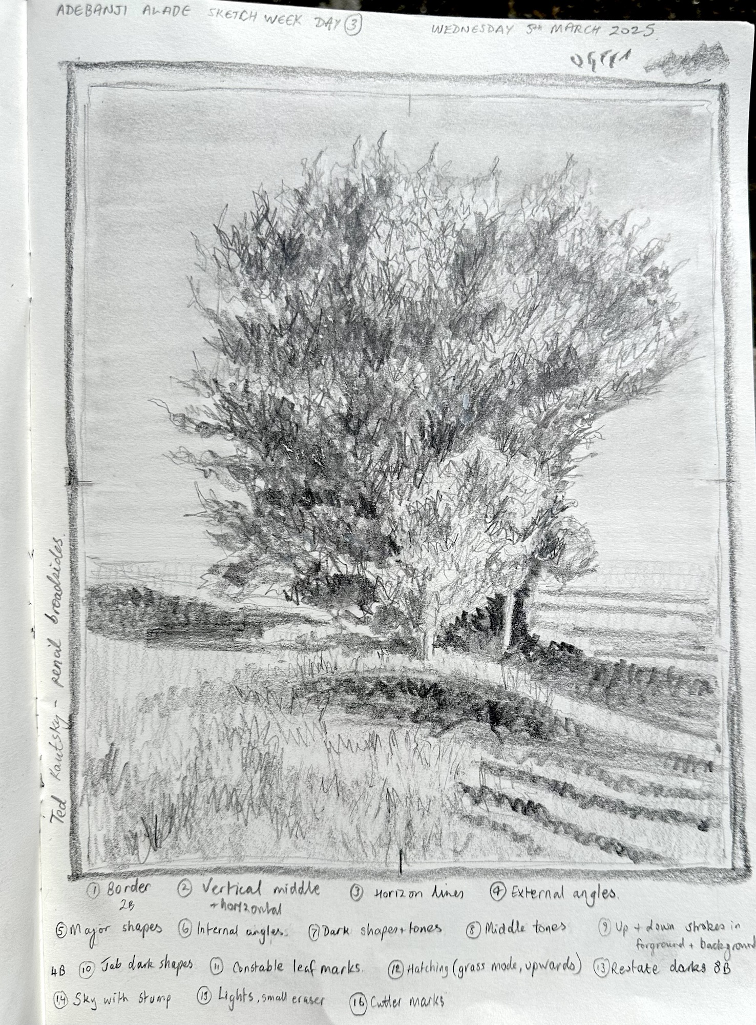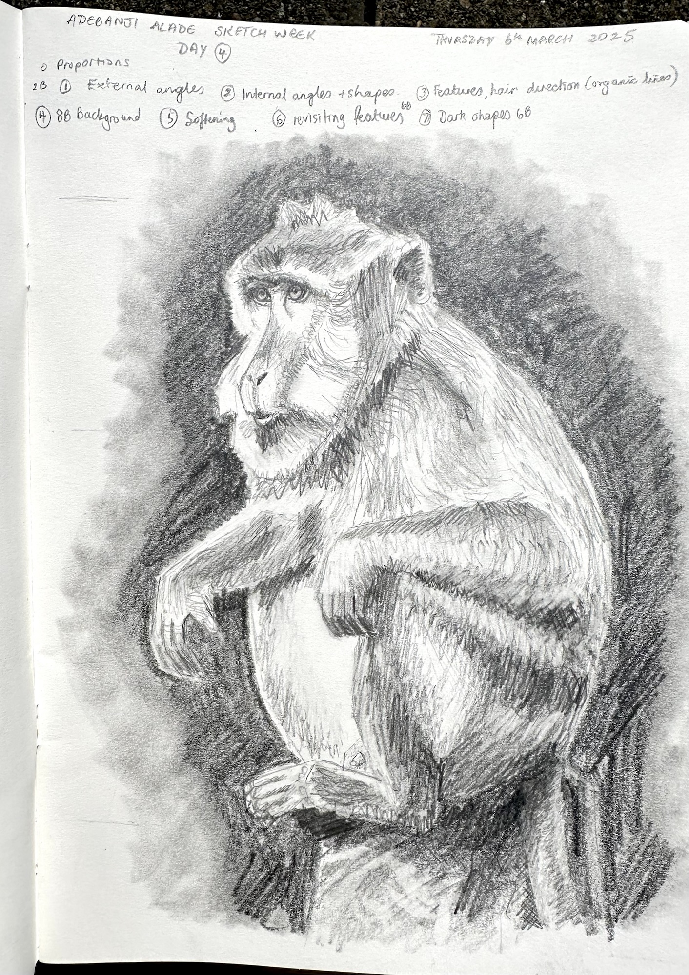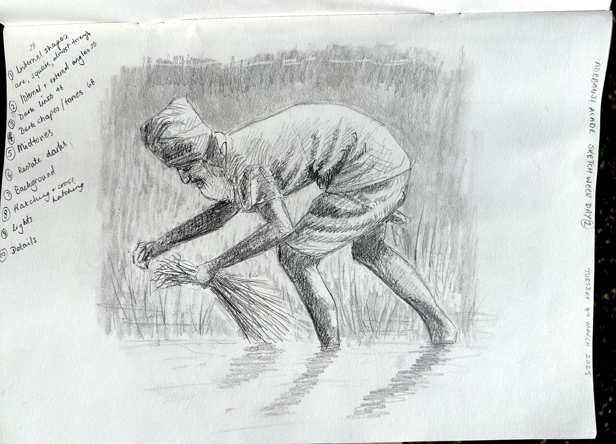 Once you sign up you’re sent a list of materials but if you have a sketchbook, pencils from 2B to 8B and a rubber, you don’t need any extras. At 7.30pm the session started online with a run through of materials and a chat about that day’s picture. Everyone is emailed the reference photos which have been taken by Adebanji or are free on the Unsplash website. You can print the pictures out or save them to your phone or tablet to use.