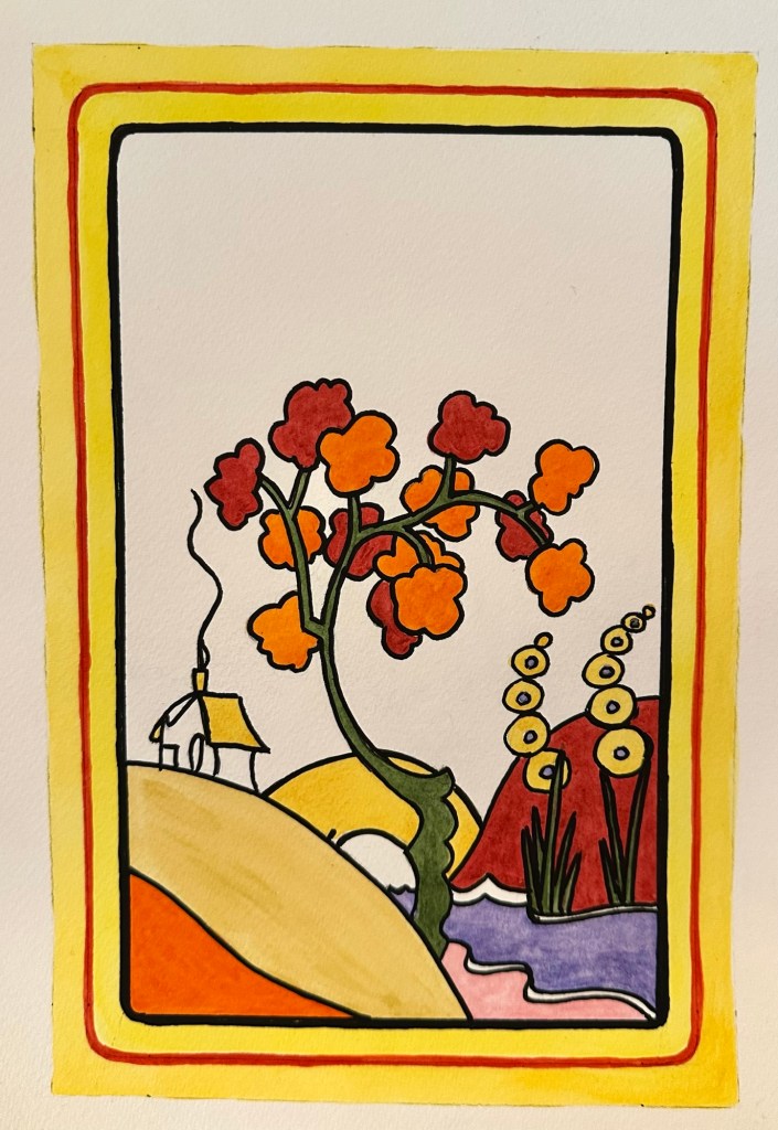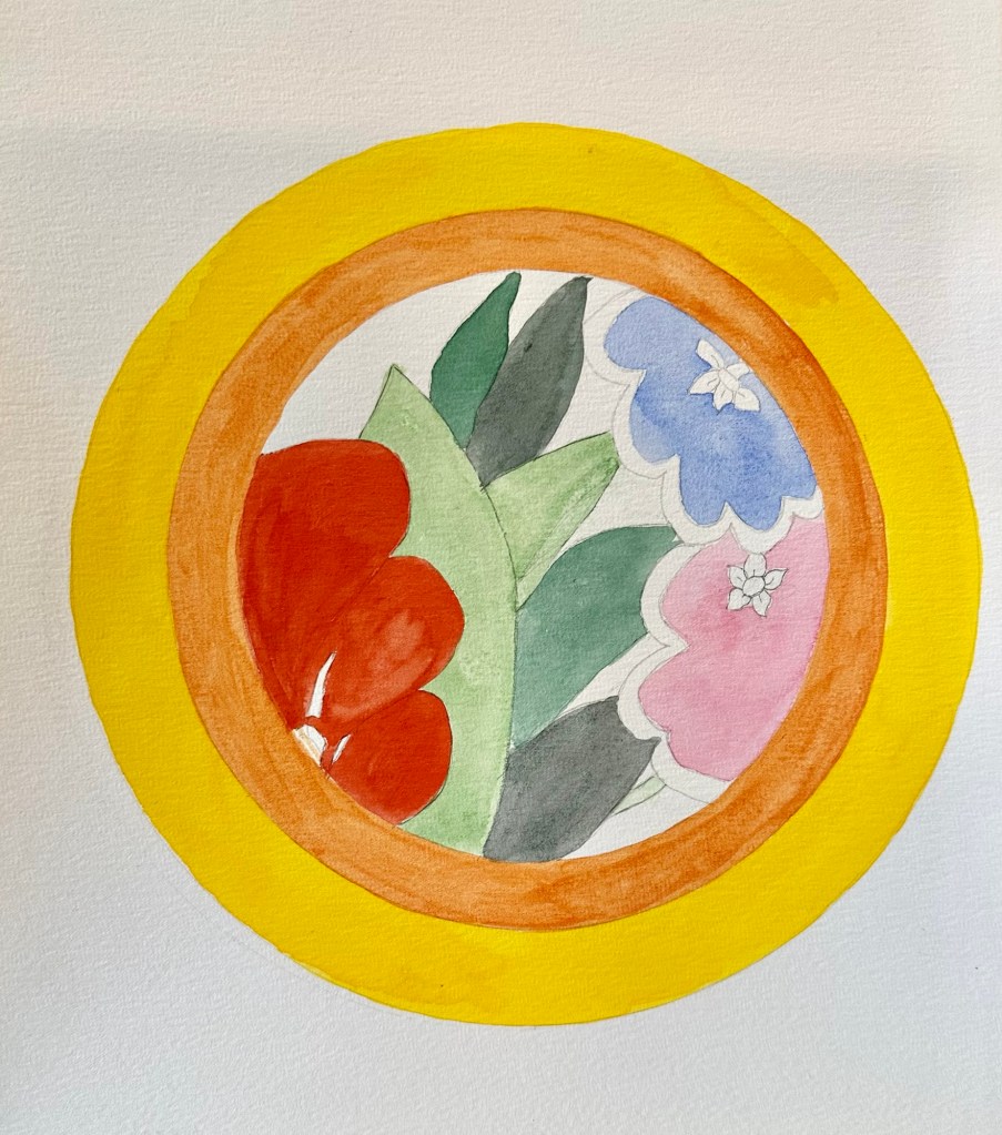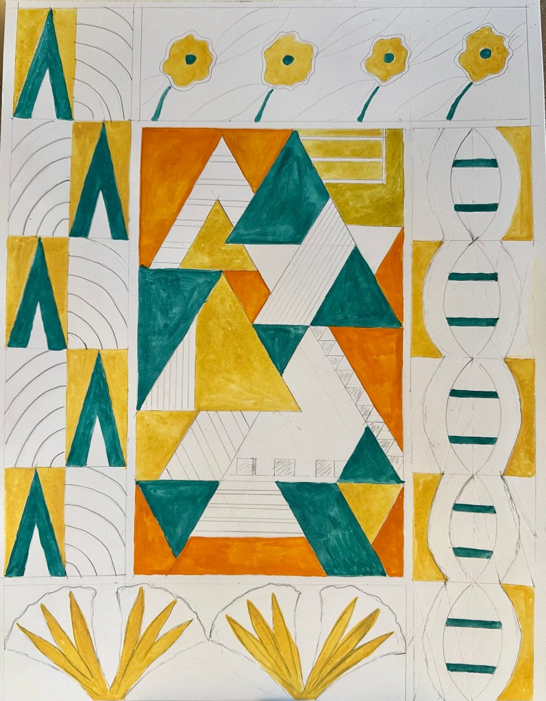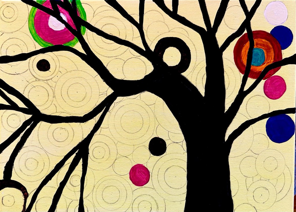 Julia started her painting at the session on Art Deco, with colourful, geometric circles her main focus. She spent a long time drawing the circles then hours painting each one in acrylics. Many of the circles have more circles on them.