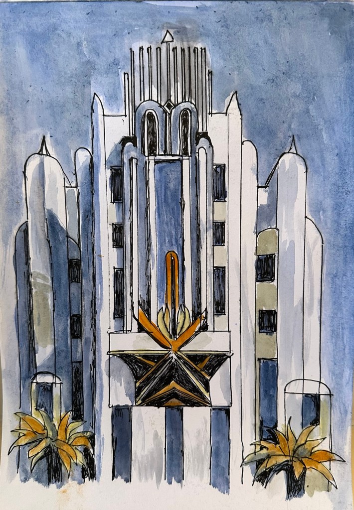 Eighteen members drew and painted images inspired by New York skyscrapers. Clarice Cliff pottery designs, elegant ladies by the artist Tamara Lempicka, objet d’art, interiors, railway posters, fashion, wrapping paper designs and car bonnet mascots.